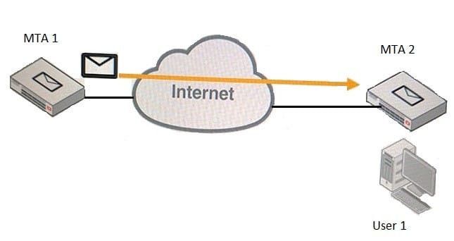 MTA 1 is delivering an email intended for User 1 to MTA 2. Which of the following statements about protocol usage between the devices are true? (Choose two.)