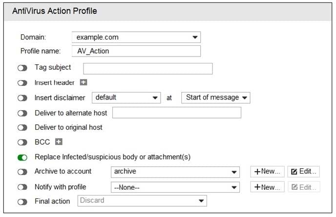 What are two expected outcomes if FortiMail applies this antivirus action profile to an email? (Choose two.)