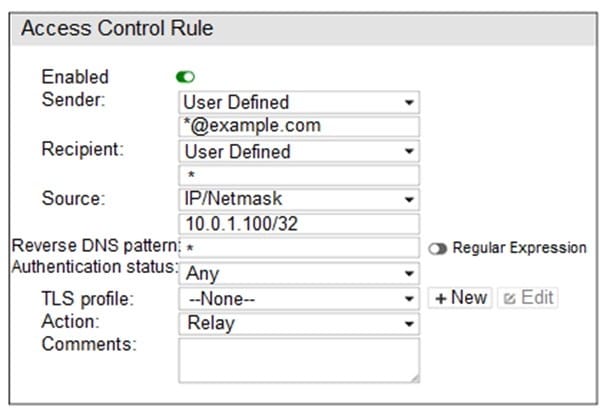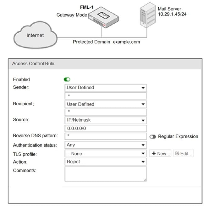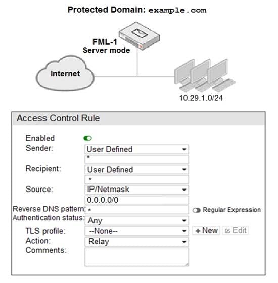 It is recommended that you configure which three access receive settings to allow outbound email from the example.com domain on FML-1? (Choose three.)