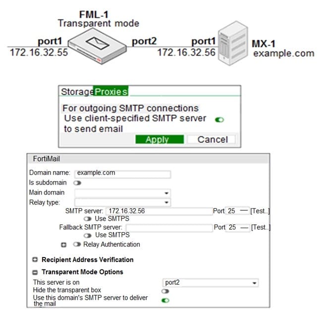 Which two statements about how the transparent mode FortiMail device routes email for the example.com domain are true? (Choose two.)