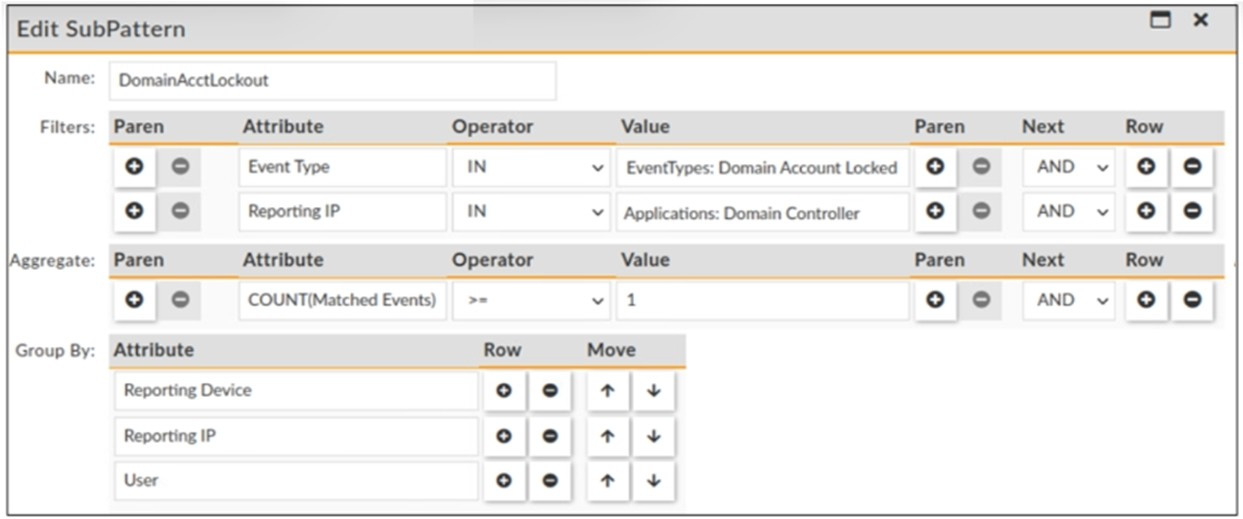 D. The rule filters events with an event type that equals Domain Account Locked and a reporting IP that equals Domain Controller applications.