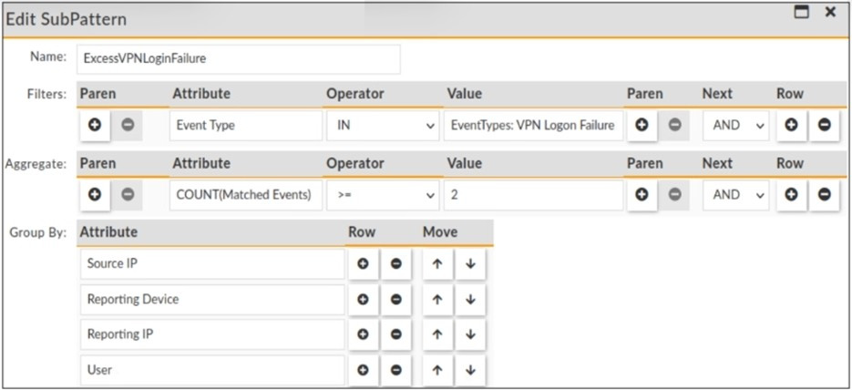 The rule evaluates multiple VPN logon failures within a ten-minute window. Consider the following VPN failure events received within a ten-minute window: