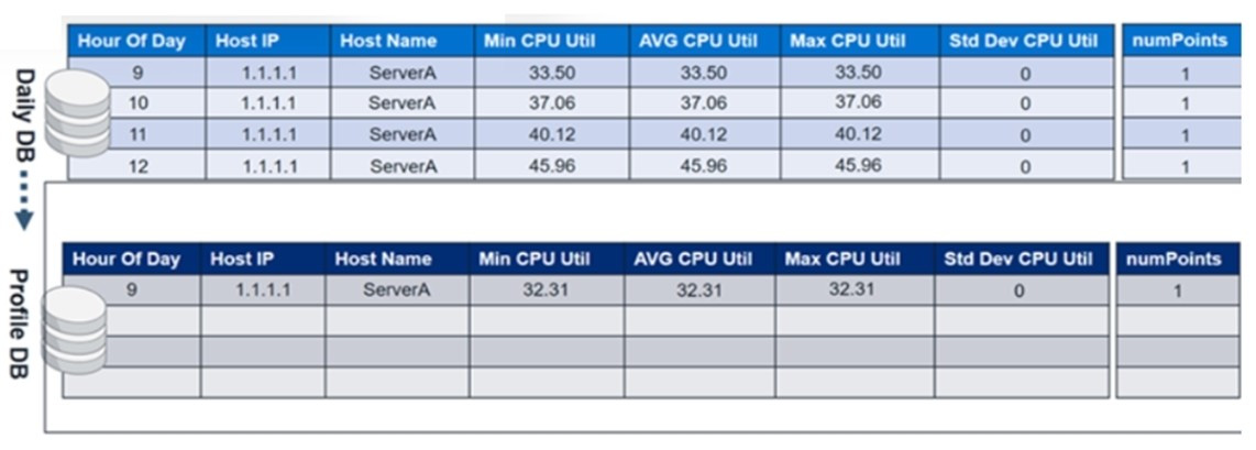 The profile database contains CPU utilization values from day one. At midnight on the second day, the CPU utilization values from the daily database will be merged with the profile database.