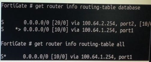 Why is the port2 default route not in the second command's output?