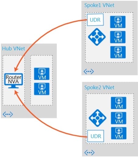 Refer to the exhibit. Which two conditions will enable you to segregate and secure the traffic between the hub and the spokes in Microsoft Azure? (Choose two.)