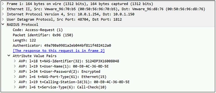 Examine the packet capture shown in the exhibit, which contains a RADIUS access request packet sent by FortiSwitch to a RADIUS server.