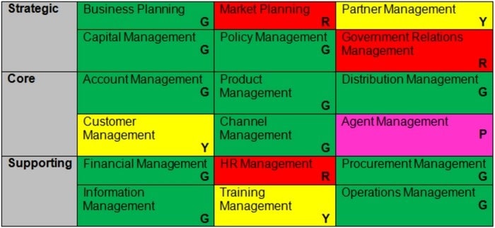 Consider the following business capability map, where cells of a model are given different colors to represent maturity levels (note the letters G, R, Y, P also denote the colors used = Green, Red, Yellow and Purple):