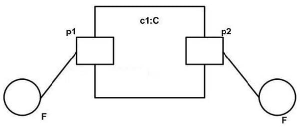 B. Requests for behavioral features of interface F through ports p1a nd p2 will always result in the same behavior.