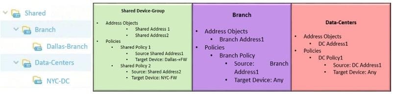 C. Address Objects -Shared Address1 -Shared Address2 -Branch Address1 -DC Address1 Policies -Shared Policy1 -Shared Policy2 -Branch Policy1