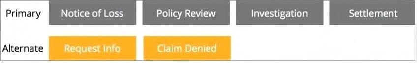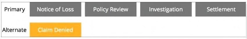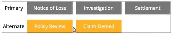 After an auto accident claim is submitted, a claims adjuster is assigned to the case. The claims adjuster reviews the policy of the claimant to verify coverage. The claims adjuster then begins an accident investigation. If the claim is denied, an appeals process is initiated. When the investigation is complete, a determination of fault is made, and then the accident claim is settled. Select the case life cycle design that most closely follows the guidelines for identifying and naming stages. A