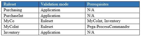 In the following example, the Purchasing, PurchasingInt, and Inventory rulesets are configured for application validation. MyCo and MyCoInt are configured for ruleset validation. The prerequisites for MyCo are MyCoInt and Inventory. The prerequisite for MyCoInt is Pega-ProcessCommander.