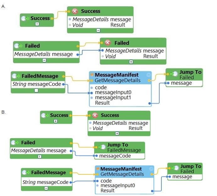 The business requirements states that the login automation creates a Success or Failed response when attempting to log in to the finance application. If a failure occurs, the automation should pass a message code with the Message Manifest before exiting the automation.