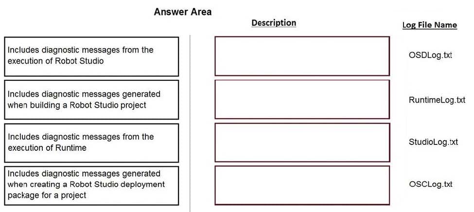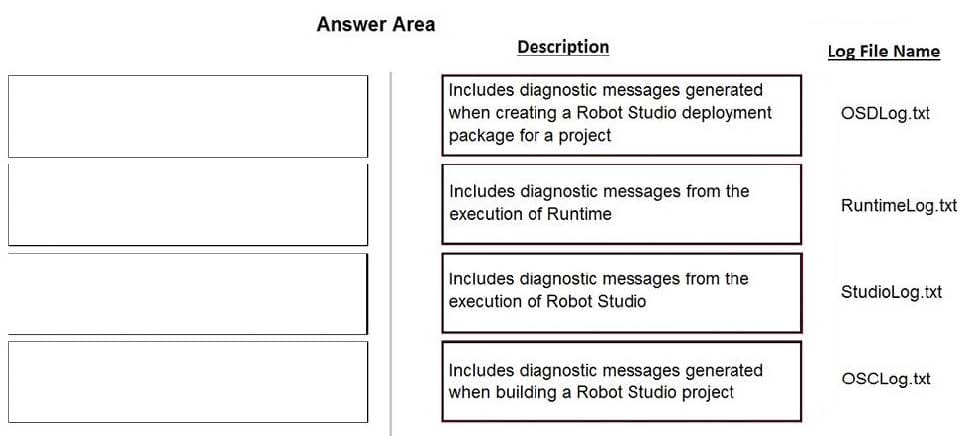 Pega Robot Studio produces several log files during the opening, building, debugging, and deployment of a solution. In the Answer Area, drag the description of the log file on the left to its correct log file name.