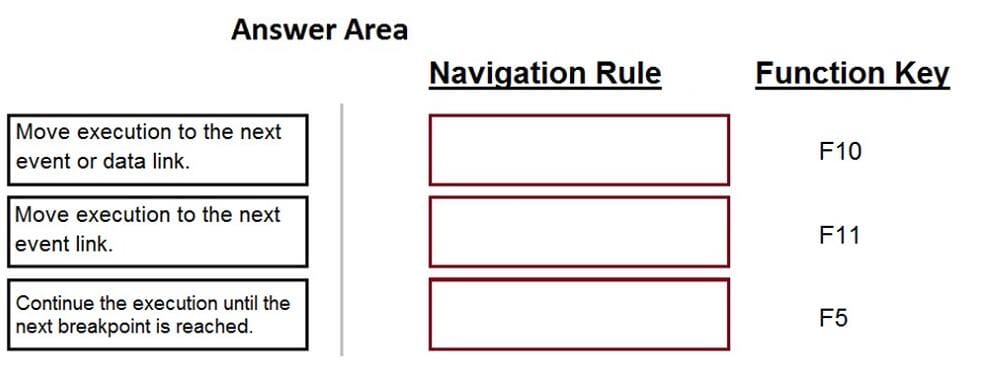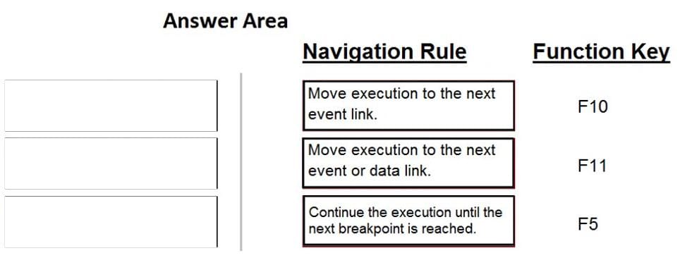 When debugging an automation, you have three function keys to use for navigating the breakpoints. In the Answer Area, drag each navigation rule on the left to its correct function key.