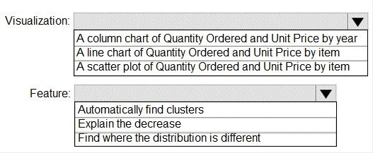 Which type of visualization and which feature should you use? To answer, select the appropriate options in the answer area.