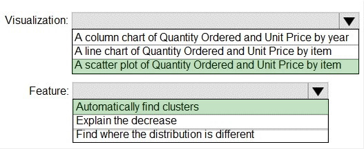 You need to create a visualization that shows the relationship between Unit Price and Quantity Ordered. The solution must highlight orders that have a similar unit price and ordered quantity.
