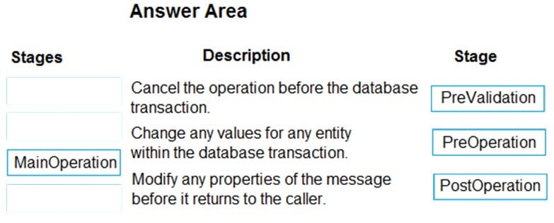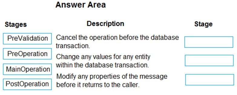 Which stage should you associate with each description? To answer, drag the appropriate stages to the correct descriptions. Each stage may be used once, more than once, or not at all. You may need to drag the split bar between panes or