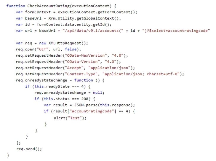 You develop the following JavaScript code for a web resource that will be used in a model- driven app.