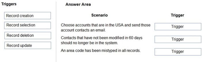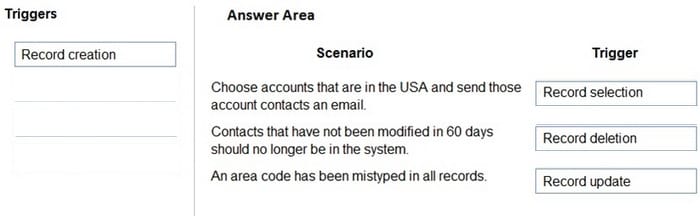 Which triggers should you use? To answer, drag the appropriate triggers to the correct scenarios. Each trigger may be used once, more than once, or not at all. You may need to drag the split bar between panes or scroll to view content.