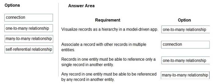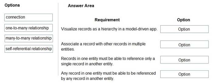 Which options should you use? To answer, drag the appropriate options to the correct requirements. Each option may be used once, more than once, or not at all. You may need to drag the split bar between panes or scroll to view content.