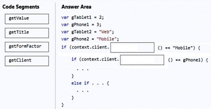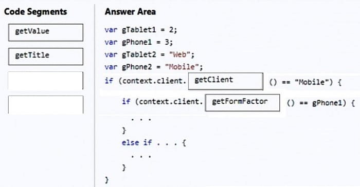 How should you complete the code segment? To answer, drag the appropriate code segments to the correct locations. Each code segment may be used once, more than once, or not at all. You may need to drag the split bar between panes