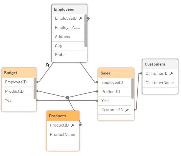 C. Perform a composite key in the Sales and Budget tables instead of loading Year, EmployeeID, and ProductID