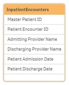 The initial date table (InpatientEncounters) contains a patient admission date and discharge date for each patient encounter. The data architect will use set analysis to calculate the number of admissions and discharges in the chart.