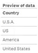 The business analyst previews some data and notices different values for the United States in the Country field. The analyst must be able to report the total sales for the United States. The data architect must fix this issue in the LOAD script.