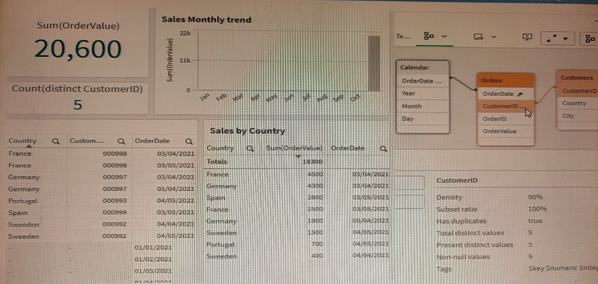 The Sales by Country table shows a total OrderValue of 18,300 sales while the KPI shows a total OrderValue of 20,600.