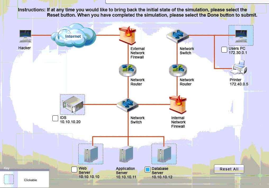 Instructions: The web server, database server, IDS, and User PC are clickable. Check the box of the node(s) that have been compromised and drag and drop the appropriate actions to complete the incident response on the network. Not all