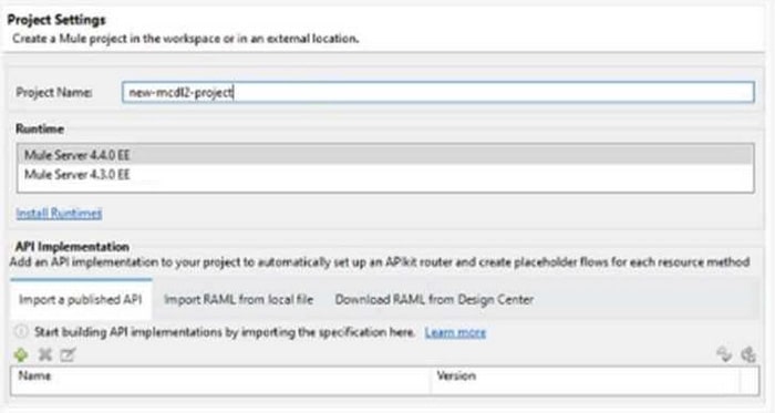 When creating a new project, which API implementation allows for selecting the correct API version and scaffolding the flows from the API specification?