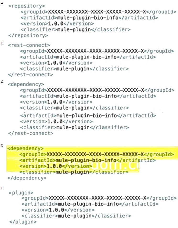 Bioinfo System API is implemented and published to Anypoint Exchange. A developer wants to invoke this API using its REST Connector. What should be added to the POM?