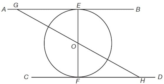 In the diagram above, line AB is parallel to line CD, both lines are tangents to circle O and the diameter of circle O is equal in measure to the length of line OH. If the diameter of circle O is 24 in, what is the measure of angle BGH?