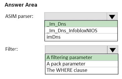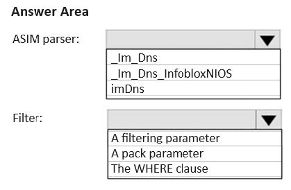 You need to implement the ASIM query for DNS requests. The solution must meet the Microsoft Sentinel requirements. How should you configure the query? To answer, select the appropriate options in the answer area. NOTE: Each correct selection is worth one point.
