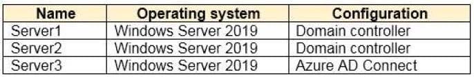 The Azure Active Directory (Azure AD) tenant syncs to an on-premises Active Directory domain. The domain contains the servers shown in the following table.