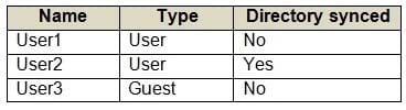 Your network contains an on-premises Active Directory domain that syncs to an Azure Active Directory (Azure AD) tenant. The tenant contains the users shown in the following table.