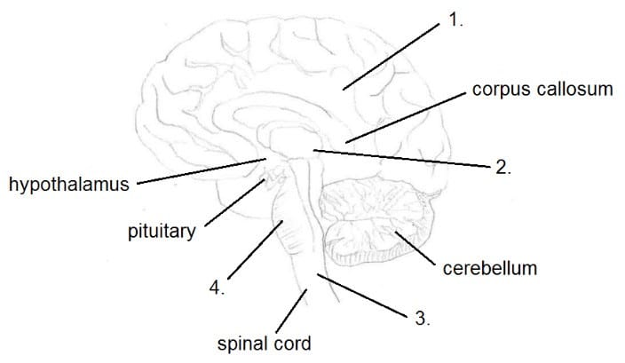 A. 1. cerebral cortex, 2. thalamus, 3. medulla oblongata, 4. pons