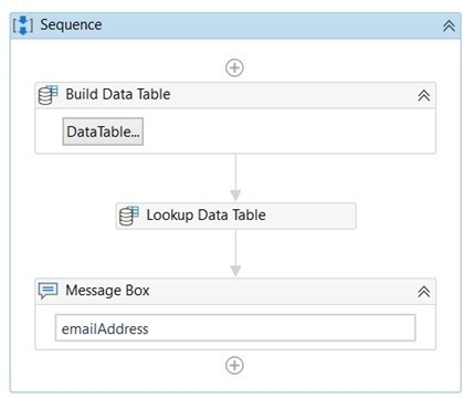 A developer uses a Lookup Data Table activity to return an email address of a person. What will be the result of the execution of the following seqeunce?