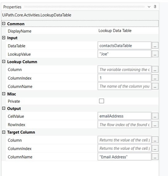 Please find the properties of Lookup Data Table activity below