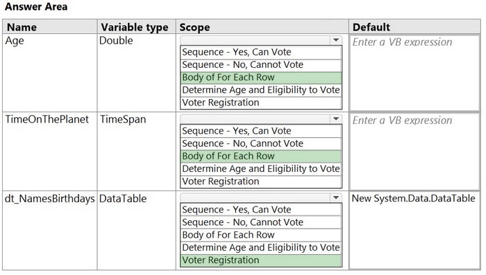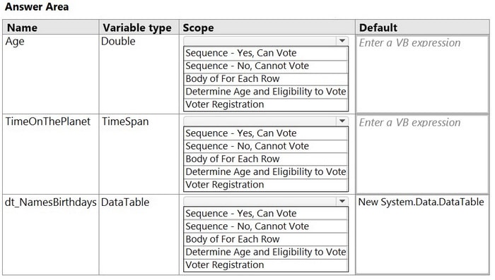 Based on best practices, select the correct Scope for each Variable type from the drop-down lists shown in the following exhibit. Hot Area: