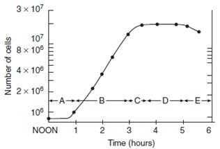 After isolating a pathogen from a patient, you monitor its growth in rich medium. According to below figure the rate of growth of the bacterial culture for which it was obtained reaches its maximum rate of growth between which of the following time periods?