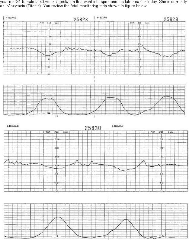year-old G1 female at 40 weeks' gestation that went into spontaneous labor earlier today. She is currently on IV oxytocin (Pitocin). You review the fetal monitoring strip shown in figure below.